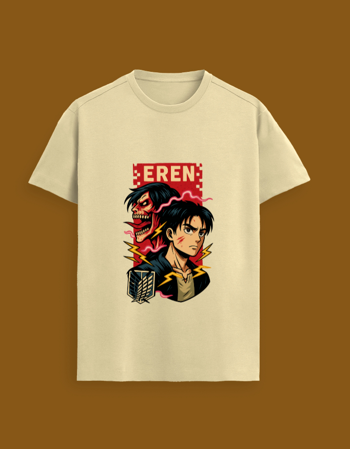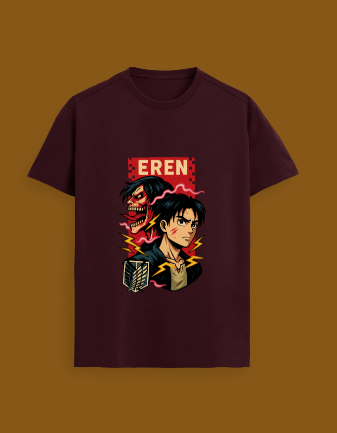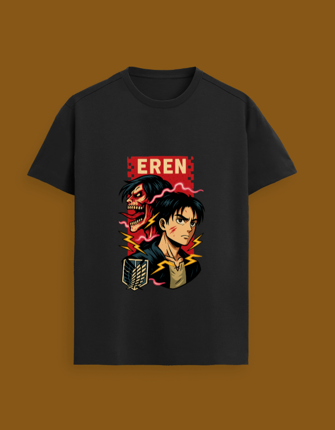 Unleash your inner titan with this bold Eren Yeager Attack on Titan T-Shirt. Featuring an eye-catching design of Eren in both human and Titan form, this tee is perfect for fans who want to showcase their love for the iconic anime.