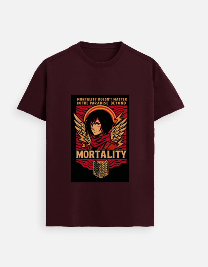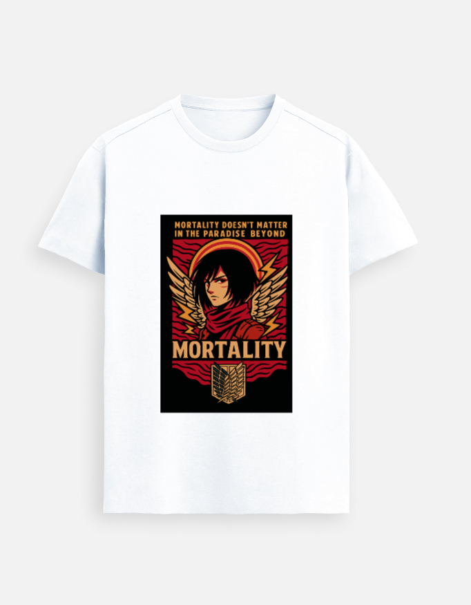 Stand out with this bold Attack on Titan inspired graphic T-shirt. Featuring a striking artwork of Mikasa Ackerman with wings and halo design, along with the powerful quote “Mortality Doesn’t Matter in the Paradise Beyond”, this tee perfectly blends anime aesthetics with streetwear style. Made from soft, breathable cotton, it keeps you comfortable while showing off your love for anime.