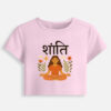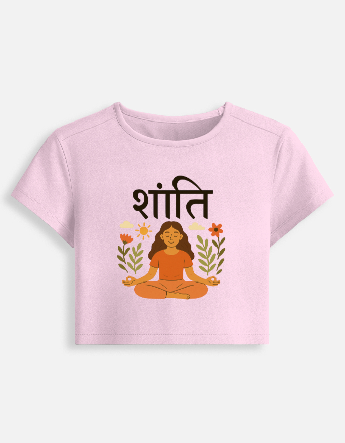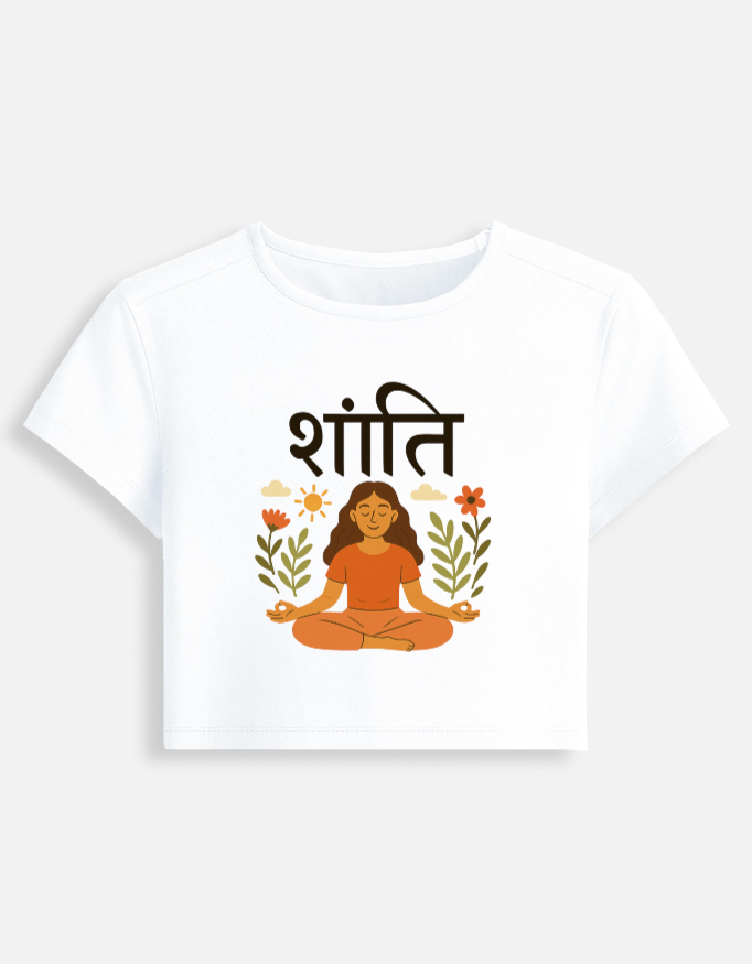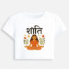 The serene meditating figure with floral artwork radiates positivity, while the bold Hindi typography “शांति” brings cultural depth and uniqueness to your wardrobe.